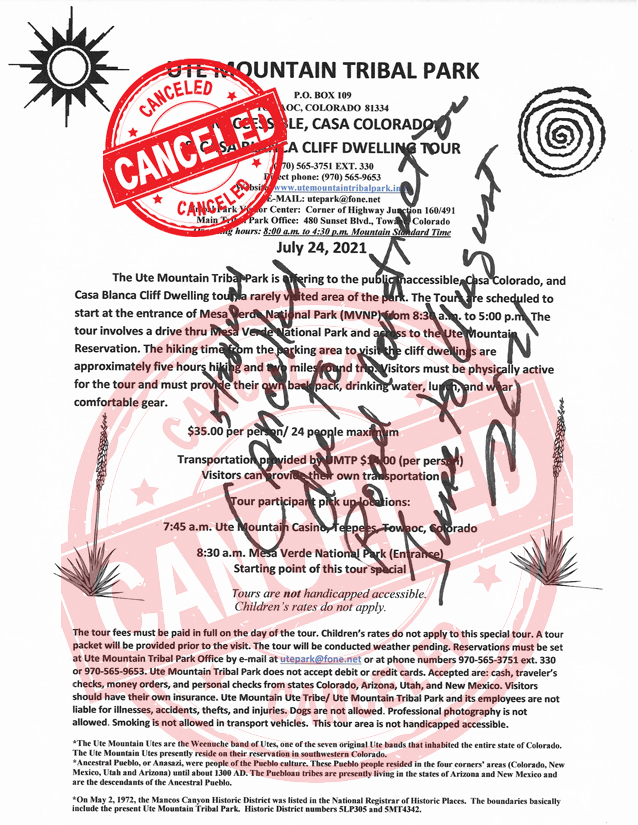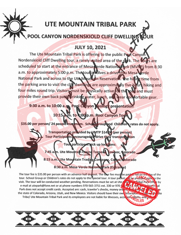 The Ute Mountain Tribal Park is offering to the public Pool Canyon Nordenskiold Cliff Dwelling tour, a rarely visited area of the park. The Tours are scheduled to start at the entrance of Mesa Verde National Park and across to the Ute Mountain Reservation.